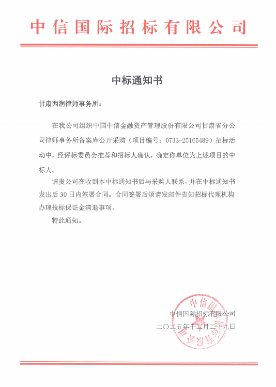 近日,我所凭借金融法律与特殊资产处置领域的专业积淀,在中信国际招标有限公司组织的公开采购中脱颖而出,成功中标中信金融资产管理股份有限公司甘肃省分公司律师服务备选库入库项目,正式成为其合作备选库成员。